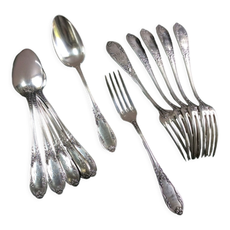 Authentic, purely french art deco silver-plated metal with hallmarks, here is a set of table cutlery with a retro vintage charm on your table - late 19th century - early 20th century composed of: - 12 forks - length 21 cm. - 11 large spoons - length: 21.2 cm. - 11 small dessert spoons - length: 14.5 cm. Total weight: 1.850 kg. Good vintage condition: minimal signs of use. Care: hand wash only. These table cutlery are over 100 years old.