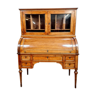 Secretary type "bonheur du jour", in Louis XVI style. With a cylinder and steps. Gallery and brass trims. Bronze key that locks all the drawers. Leather on the top to be restored or kept as is to maintain authenticity. Beautiful piece of furniture, in good condition and very functional.