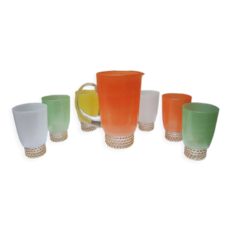 6 esso glass doors and advertising glasses. They were offered by esso gas stations in the 70's. Plastic glass holders can fit on other glasses. Total height: 13.5 cm – diameter of the top of the glasses: 6 cm. Together in very good condition.