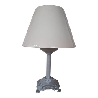 Table lamp with a taupe patinated base, whitewashed effect and golden reflections. Base decorated with acanthus leaves. Off-white fabric lampshade in a conical shape for E14 bulb. Plug + cord + switch: gold. Works perfectly. L15 X h28 X p15. Ref 2241.