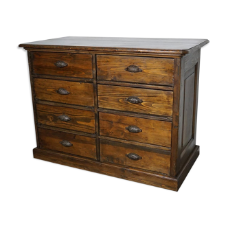 Nice small elm wooden workbench. Features 8 drawers with metal handles. Workbench has been cleaned and laquered and remains in good condition. Signs of wear consistent with age and use.