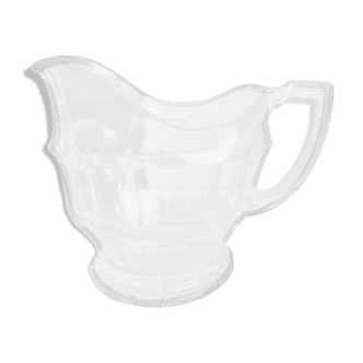 Jars and company: old thick glass carafe. Star-shaped bottom excellent condition dimensions: height: 15 cm width (from spout to handle) 21 cm bottom dimension: 10.5 cm X 9 cm capacity: 0.6 liter category: carafes reference: f24-015.