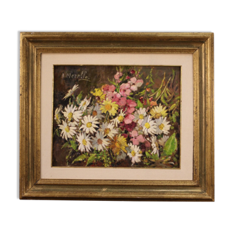 Still life, country bouquet signed Tellier. Black painted wooden frame. Attachment on the back.