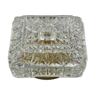 So Deco! Ceiling light or wall light, square, made of moulded glass with a "diamond point" pattern. It offers a beautiful golden and sparkling brightness. Black metal support. E27 porcelain socket. Height: 12 cm Width: 24 cm Depth: 24 cm Weight: +/- 1 kg.