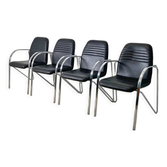 Sometimes, a single gesture is enough to capture an entire era. Here, it takes the form of a suspended curve, drawn in a single sweep in chromed steel: a supple and airy line, the signature of an Italian minimalism that has become an international icon. Born in the inventive ferment of the Italian peninsula in the late 1970s, these eight cantilever chairs bear the discreet—yet instantly recognizable—mark of the Venetian firm Effezeta, and perfectly embody that rare moment when form breaks free from constraints, when function fades behind the poetry of movement. The eye is first captivated by an evident fluidity: a chromed steel tube, curved in a single stroke, sketches the cantilever loop before rising into armrests and suspending, as if weightless, the seat and backrest. Nothing is superfluous; everything is continuous movement, like an uninterrupted stroke of the pen. The structure breathes, becoming almost metallic calligraphy. Take a seat: beneath their apparent simplicity, these chairs conceal a more intimate promise. The promise of a seat that intuitively adapts to every movement, offering an exquisite sensation of suspension and surrender. The black vinyl upholstery, with its subtly textured matte grain reminiscent of the refined feel of Italian automotive leathers from the 1970s, irresistibly invites the hand to linger, extending the visual pleasure with a voluptuous tactile experience. Experience it: choose tangible fluidity, visual serenity, the assurance of owning a still vibrant piece of Italian design. In ten years, these pieces will retain this aura of balance. And in twenty years, they will still bear witness to an informed choice, a passion for the timeless that has become, with time, self-evident. - Origin & Period: Italy, c. 1978/85 (technical file supporting this attribution available upon request) Good overall condition (described in more detail upon request).