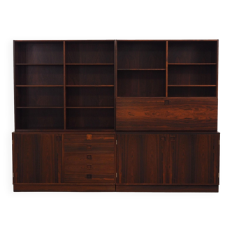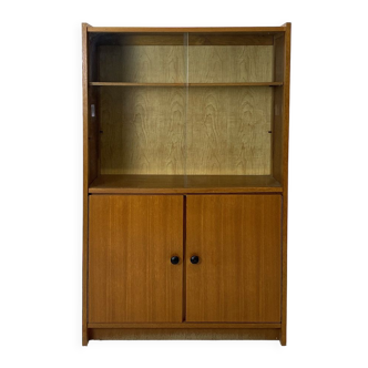 Vintage bookcase composed of two modules, the lower part is a small sideboard with a door and drawers, while the upper part is a structure equipped with open shelves and a display case. The essential lines and the light color of the oak give the furniture a warm and welcoming aesthetic, typical of Scandinavian design. This piece is ideal for the living room, dining room, or office, adding elegance and practicality with a modern and timeless style. Good condition, conservative restoration carried out with natural products. It may show some signs of aging. Please pay attention to the photographs. Ae519.
