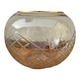 Stained, blown and molded glass ball vase, with stylized flower decorations, 1940s, no chips, numerous bubbles in the mass, see photo.