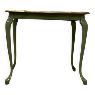 Small renovated console in a chic and contemporary style. This piece, salvaged from a recycling centre, suffered from its orange varnish. It has been thoroughly cleaned and sanded, covered with two coats of paint and gold, then varnished. It now looks splendid and can serve as a side table, end table, or bedside table. It harmonises perfectly with another piece visible in my shop to form an asymmetrical and original duo.