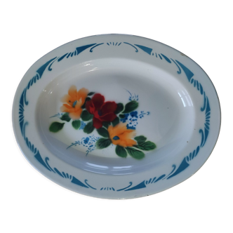 Small old oval dish with floral decoration, its golden perimeter is erased in places and its discoloration task (see photo) deepen this vintage side that suits it so well. Maybe diverted into a pocket empty... Unable to decipher the stamp underneath or identify its punch.