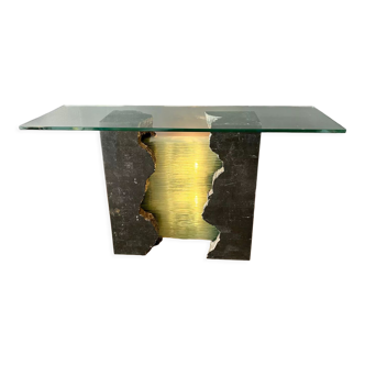 Coffee table, hazed glass mactan stone coffee table by magnussen ponte, 1980s.