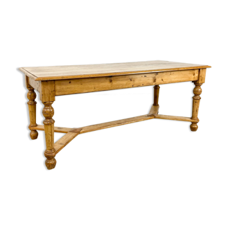 Restored antique farmhouse table – Solid wood – 183 cm. Elegant and timeless, this restored antique farmhouse table has been meticulously refurbished with attention to detail to reveal the nobility of its wood and original lines. Originating from utilitarian antique furniture, it has withstood the test of time while retaining a beautiful authenticity, now enhanced by careful restoration carried out entirely by me. The solid wood tabletop features a warm, vibrant patina, with subtle traces of the past that give it character. The structure is robust, stable, and perfectly functional. Each intervention has been designed to respect the soul of the piece: deep cleaning, gentle sanding, wood treatment, and finishing with care oil to nourish, protect, and provide a natural, silky touch. With its generous proportions, this table stands out as a central piece in a dining room, large kitchen, or refined workspace. It pairs well with both bistro chairs and an antique bench, in a simple and elegant spirit. Dimensions: Length: 183 cm Width: 81 cm Height: 79 cm Legroom height: 59 cm.