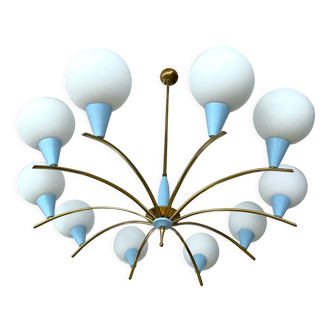 Elegant copper spider or sputnik chandelier with cut glass details. The light shades have a 'curled' finish and the chandelier has the right patina. 1950s - france. Works with bayonet lamps. Tested and ready to use. The chandelier has 12 lightpoints. Height: 60cm/23.62" Diameter: 70cm/27.55" Ref: 838875.