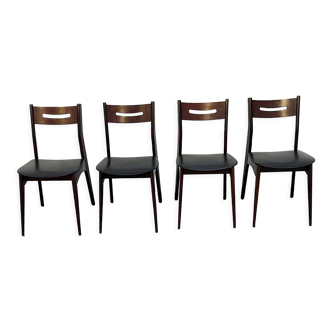 4 chairs from the 70s scandinavian style. Solid wood structure and black skaï seats. Together in good condition, just a hitch on one of the seats. Dimensions l43 p45 h83 cm.