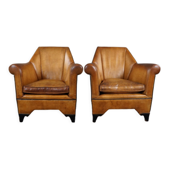 Offered here this set of 2 highly desirable sheepskin leather club armchairs by nico van oorschot, featuring a unique and beautifully aged patina. Enthusiasts of sheepskin furniture are always on the lookout for that perfect pair of club chairs with just the right character — and trust us, this set has it! Through responsible use, they’ve developed the sought-after look that makes sheepskin leather furniture so appealing. Ergonomically, they are also a delight to sit in, thanks to their slightly sloped armrests, which provide a more open and relaxed seating experience. Structurally, they are in good condition and ready for immediate use. Are you as enthusiastic as we are Please note: the dimensions stated in our advertisement are binding. Photos are part of the description. Dimensions (each chair): height: 82 cm. Width: 80 cm. Depth: 83 cm. Seat height: 46 cm. Seat depth: 55 cm. Sku: 15042505.