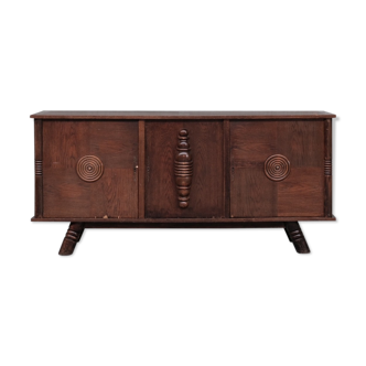 Experience the refinement of this cabinet, designed by Charles Dudouyt, a key figure in the history of French furniture design. Dudouyt, born in 1885, was a pioneer in Art Deco and modernist styles. His work is renowned for its robust proportions and elegant woodcarvings, as evident in this unique cabinet. After World War I, he opened La Gentilhommière in Paris, where he created iconic furniture pieces that are still internationally appreciated by collectors and connoisseurs. This cabinet is made of solid oak wood and exhibits beautiful geometric patterns and sculptures, like the carved ball feet...Seize the opportunity to bring a piece of design history into your home and be enchanted by the elegance of this masterpiece. It’s a real a tribute to the artistic role Dudouyt played in the French furniture era. Details. Manufacturer: Atelier Charles Dudouyt|Year: 1930s - 1940s|Country: France|Condition: Very Good|Materials: oak, copper|Height: 108 cm| Width: 225 cm|Depth: 60 cm.