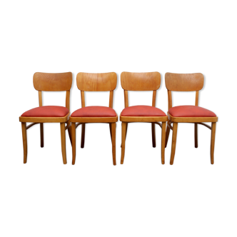 Beautiful series of 5 compass foot chairs from the 50s. Nice backrest, original skaï in good condition, comfortable and stable chairs. Height: 81cm, width: 44 cm, sitting height: 46 cm, depth: 43 cm.