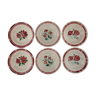 Set of 6 flat plates in the style of badonviller. Beautiful stencil decoration with a floral pattern in blue tones. For a very vintage table! The plates are not signed. They're in good condition. One has a small defect in the enamel (see photo). Three of the plates are slightly lighter than the others. Diameter 22.8 cm.