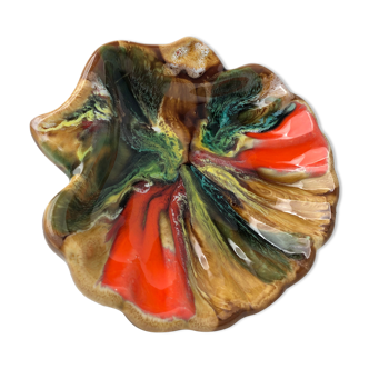 Large vallauris dish signed, enamelled ceramic signed vallauris on the reverse. Brown and yellow flaming effect emailing. Several small shards on the edge but good general condition. Stunning big room.