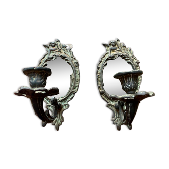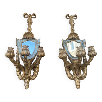 Very beautiful sconces, brass and tulip lampshade in marbled opaline. In very good condition. Note that the mirrors have traces of age height 40cm.
