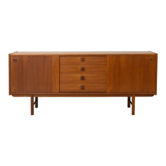 1950s Scandinavian sideboard with a balanced layout, featuring central drawers and contrasting wood details. Scandinavian sideboard from the 1950s featuring a central row of drawers with subtly recessed handles, distinguished by their elongated oval profile and refined proportions. The teak veneer is enhanced by contrasting oak details, creating a delicate chromatic interplay between warm and lighter tones. Slightly raised side edges accentuate the top’s design, while the two side compartments with hinged doors and fixed shelves contribute to a harmonious and well-structured composition. Gently tapered legs complete the silhouette with the lightness typical of mid-century Scandinavian furniture. Good condition. May show signs of age. Please pay attention to the photographs. AF995.