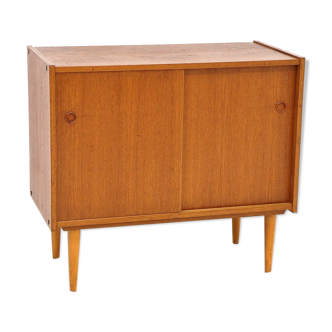 A teak chest of drawers manufactured in the 1970s. The piece of furniture is equipped with a pair of sliding doors, behind which there is a shelf with the possibility of fixing it at different heights. The chest of drawers is preserved in good condition (has traces of use).