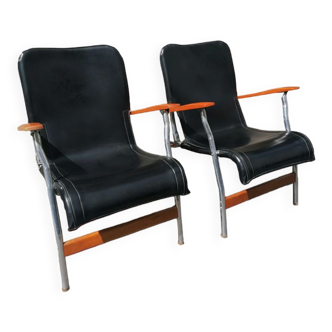 Superb Beverly armchair edited by B&B Italia, designed by Antonio Citterio. Iconic Italian design, both elegant and functional thanks to their polished aluminium folding structure. • Polished mirror aluminium structure. • Thick black leather upholstery. • Comfortable and very stable seat. • Minimalist and timeless design. • High-end Italian craftsmanship. Available. 2 high-back armchairs. These armchairs are particularly sought after for their lightweight design and discreet folding mechanism, making them as practical as they are aesthetic. Condition: very good overall condition. Ideal for a living room, office, or design interior.