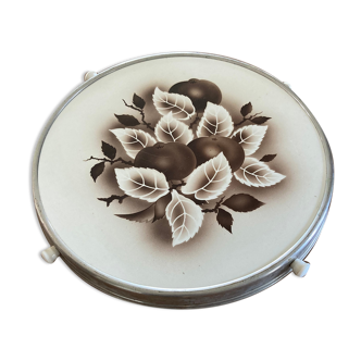 Service platter or cake stand in Art Nouveau style, featuring a ceramic tray adorned with a pattern of plums, and a brass mount with two handles featuring openwork designs. It is in its vintage condition: the ceramic tray has multiple small scratches as well as three beginnings of cracks. The brass mount is in generally good condition with signs of oxidation on the back. It is numbered 1501-6006 in blue ink, and the number 28 is printed. A partially missing label prevents us from identifying its manufacturer. It is a finely crafted object with a distinct character that will find a good place in decoration as well as in service. Dimensions: 42.5 X 34 X 1.5 cm. Careful packaging. I am happy to answer any questions you may have regarding the items and their delivery. Feel free to explore my Selency shop.