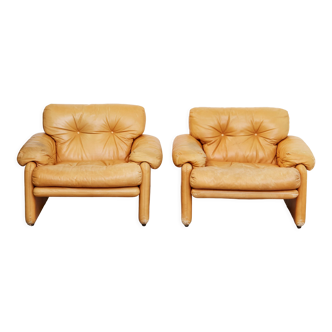 Pair of Cognac Leather Club Armchairs & Wood - Italian Design - 1970s