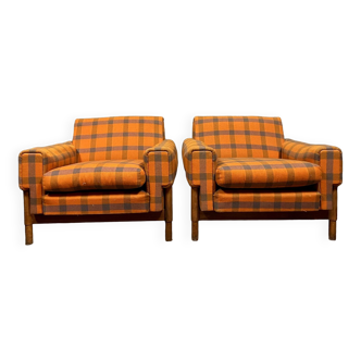 Pair of armchairs with a wooden structure and soft cognac leather cushions. Italian design. 1960s/1970s.