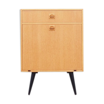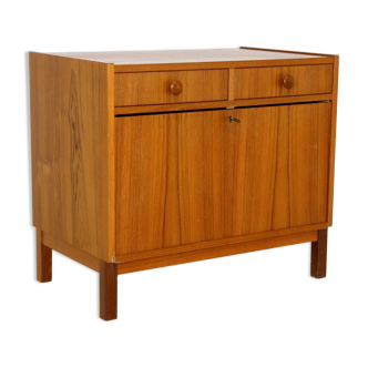 Wooden furniture and quality wood veneer. Solid, practical with 2 storage compartments. Compass feet finished with brass tips, the handles are also original. The top has been painted white and the rest is in good vintage condition with some traces of his experience. Height 50 cm. Width 52 cm. Depth 35 cm. Weight 9 kilos.
