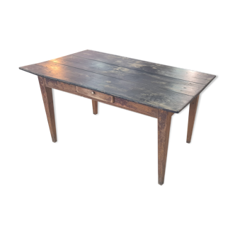 Farm table early xxè, in solid pine. 4 drawers, 2 of which have been redone in the past in plywood, little visible except for two different shell handles. The wood is healthy, the table is heavy and solid. The tray is very slightly curved in its center but this is only visible from a distance. 210 cm / 100 cm.height of the tray 72 cm, height under the headband 57 cm.