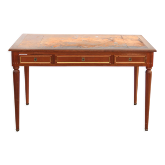 Louis XVI style bureau plat in mahogany-effect stained wood top covered in tawny leather extended by two side pulls opens with two belt drawers rests on four round-section legs ending in bronze sabots manufactured in the twentieth century good condition.
