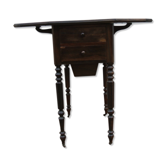 Vintage wood/wrought iron sewing machine table with a folding board and 4 integrated casters. Dimensions: height: 82.5cm. Length: 90cm (length with unfolded board 126cm) width: 45cm. Weight: 26kilos. Good general condition (some normal signs of wear given its age).