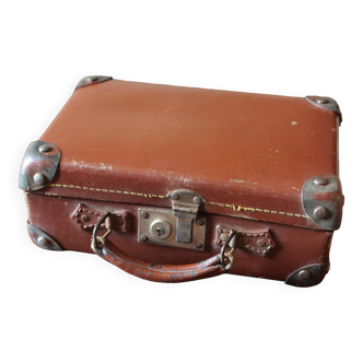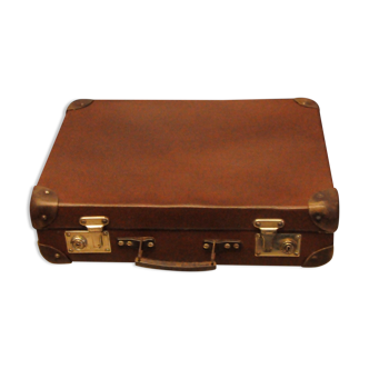 Vintage black leather case with 2 handles and red interior. Unbranded. Very good quality. Slight signs of wear on handles visible in photos. 36x28 cm. Thickness 17.5cm at the bottom and 8 cm at the top.