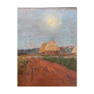 Small old painting. Oil on wood. Rural theme. Some minor chips in the paint which are easy to restore. It can also be hung as is. 35x28cm.