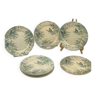 Dive into the refinement and hospitality of the great houses of the late 19th century with this high-quality earthenware service stamped "U&C Sarreguemines", a famous French pottery sought after by collectors. The "Neige" model celebrates nature with birds nesting in frosted branches, in a deep and soothing grey-green hue. This set includes a presentation plate (Ø 27 cm), an oval dish (30 X 22 cm), a serving dish (24 X 11 X 4 cm), and 5 flat plates (Ø 23 cm). The earthenware features a delicate crazing, a testament to its age and authenticity, perfect for a "Country Chic" or "Charming Brocante" style decor.