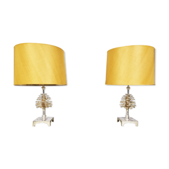 Magnificent, gilded bronze table lamp. Depicting monkeys balancing on a palm tree. Great work from the 60s. Entirely in gilded bronze, very good quality. Abat day in natural rafia not of origin. Very nice lighting once the lamp is turned on. Lamp foot height: 55 cm. Total height with lampshade: 80 cm. Maximum diameter lampshade: 40 cm. Base diameter: 18 cm. The lampshade is adjustable in all directions, thanks to the brass ball joint, placed at the end of the foot. Really a very friendly and deco object. Neat packaging. At your disposal for any questions.