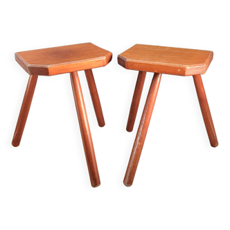 Beautiful pair of brutalist tripod stools made of solid wood, with a simple yet powerful design, reminiscent of artisanal work from the 1950s to 1970s. These pieces can also be repurposed as side tables or sculptural nightstands, ideal for a minimalist, wabi-sabi, or primitive design-inspired interior. Each stool features slight irregularities and signs of wear, testifying to their authenticity and history.