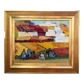Sells an old painting on animal skin from Ecuador. It is the art of Tigua, initiated by the painter Julio Toaquiza. Dimensions: 14.9 cm X 11.6 cm. Some small signs of age. It is signed.