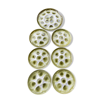 To present oysters elegantly, from the 80s, 12 beautiful large oyster plates in a shade of green, accompanied by their dish. 6 slots for oysters and one slot for lemon. Micro chips on some, almost invisible. Diameter 25 cm. The dish measures 33 cm in diameter.