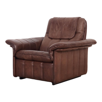 1970s, Scandinavian armchair. Original brown furniture leather, dark beech wood. Original very good condition: no smells, no stains and stable construction. Manufactured by Danish or Swedish furniture maker in about 1975-80s. Original Scandinavian vintage design directly from Denmark. The chairs were checked by craftsman. 2 chairs available.