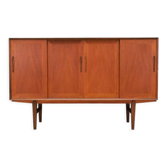 Oak sideboard from the 1950s with three doors and three drawers, brass handles and keys, front of drawers in melamine compass feet typical of the 1950s.