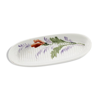 The dish is in very good condition. It has a tiny jump of enamel as big as a half pinhead on one edge, barely noticeable. No cracks, no shrapnel. It is enamelled red earth, with a vaporous and poetic decor of earth-coloured plants, a kind of evanescent and graceful ferns and grasses, against a grey background speckled with brown and khaki. The back is not emailed, and has a brand at the tip that appears to be the initials of the door or potter. It is a beautiful work, pictorial and personal, and the format, this very long oval highlighted by a small ledge is unusual. The dish can be used at the table, for service, it can also be used as a fruit cup, or as a pocket.