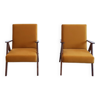 Italian armchair from the 1960s. In very good condition. The woodwork has not been renovated with visible traces of use, no cracks or signs of repairs. The upholstery of the armchair was professionally and completely changed to match the original. The armchair is covered with high-quality short-pile velvet. Brown mustard color. Excellent workmanship. A very attractive and comfortable form.
