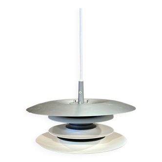 Black pendant light from the 90s, with a metal black part and two cylindrical grids made of plastic. 3 E27 bulbs (not included). Another identical pendant is available. Generally in good condition, with some surface marks (see photos). Dimensions: total height (maximum) 160 cm, height of the pendant without the wire 22 cm, diameter 40 cm. Weight 2.4 kg. Feel free to contact me for any further information and/or to make your offers. See my other items for sale.