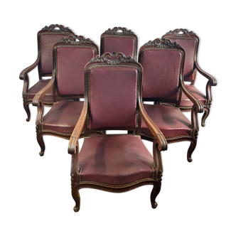 This set of seven eclectic style chairs was manufactured by the "FAMEG" bentwood furniture factory in Radomsko during the 1970s and 80s. Their standout feature is the turned decorative elements crafted from solid beech wood. The chairs are equipped with contoured armrests. The seats and backrests are upholstered. The construction of the furniture is stable and solid. The pieces are in good vintage condition (pre-restoration) with imperfections and signs of age.