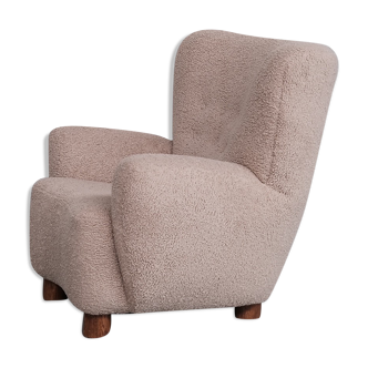 An icon of Danish design reissued in the 2010s, The Tired Man armchair designed by Flemming Lassen, a key player in the functionalist movement alongside Arne Jacobsen, in 1935 for the Copenhagen Cabinetmakers' Guild Competition stands out for its welcoming and comfortable silhouette. An invitation to relax thanks to an indisputable comfort due to an enveloping seat, generous armrests and a back covering. "The tired man" stands out with its curved shapes and padded back as a centerpiece of your stay and invites you to relax, in a modern or classic atmosphere with its timeless and aesthetic design. The feet at the back are made of wood, the feet at the front are finished by two brass wheels that allow the chair to be moved. Exposed in the shop, the feet show some marks of wear. The blue and grey colours are the versions in which the chair was originally proposed by the designer. Very good general condition Hallingdal 65 fabric by Danish publisher Kvadratl 70% wool 30% viscose Seat height 38cm Produced in Denmark