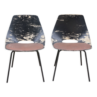 Pierre guariche (1926 - 1995): "amsterdam" model chair known as "barrel" seat in white thermoformed shell on black tubular base. Signed under the base. Dim 77 X 52 X 37 cm. Wear, some missing coating.