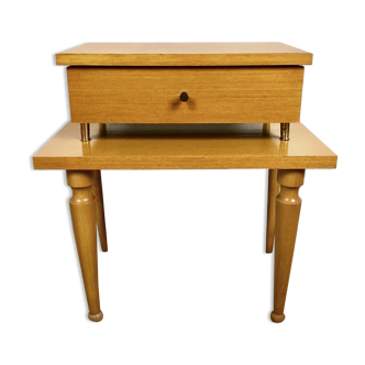 The bedside table is this little table that will watch over you while you sleep, it is the guardian of your days. “being at the bedside”: an expression that emerged in the 19th century, “bedside” meaning “head of the bed” to evoke the image of a person being watched over. Choosing a bedside table means taking care of oneself with a decorative but also functional, reassuring piece of furniture in which everyone can place photos, lamps, alarm clocks, books and so much more! We can also imagine it at the end of the sofa for a trendy decor. We are here on a style 50's - 60's which is characterized by: - scandinavian, clean and minimalist lines without ornaments. - a straight chest with a single drawer in varnished wood veneer. - refined and conical legs, generally set back from the sides. - brass finishes (button and end of feet) also conical in shape.