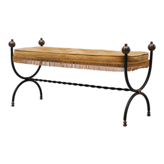 Forged iron bench with copper finish with cushions, very refined, can be complementary furnishings that finds its ideal place in a bedroom as a bed end, but also in a classic living room as a sofa end, in a hallway, matched with a mirror or painting. An object of rare beauty for an interior with refinement, style, exclusive and original. Height: 66cm. Seated height: 46cm. Length: 118 cm. Width: 30 cm.